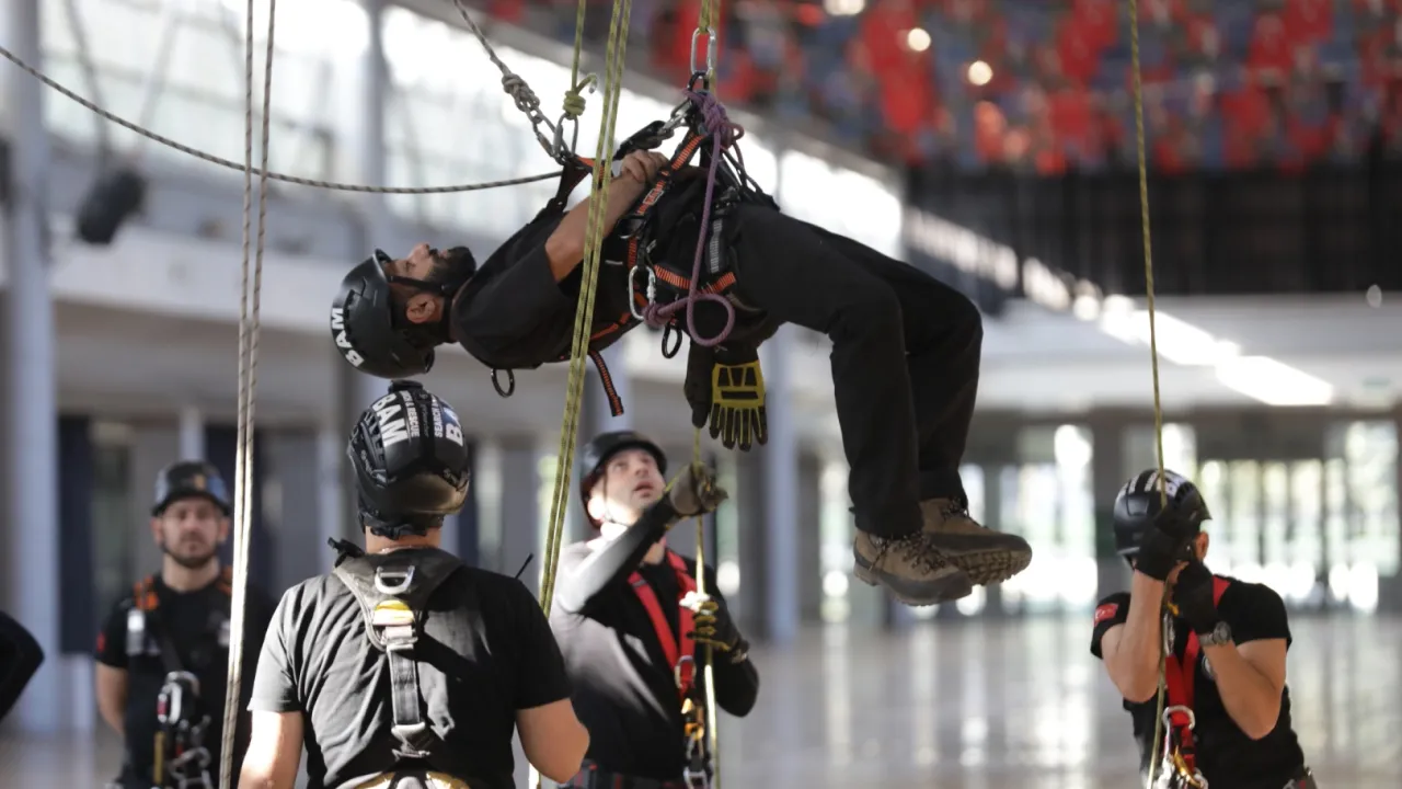 Merinos Yerleşkesi Fuaye Alanı'nda 'İple Kurtarma Sistemleri ve Arama-Kurtarma eğitimi' alan ekipler, uzman eğitmenler eşliğinde tavana asılı halatlara güvenlik ekipmanlarını kullanarak tırmandı.