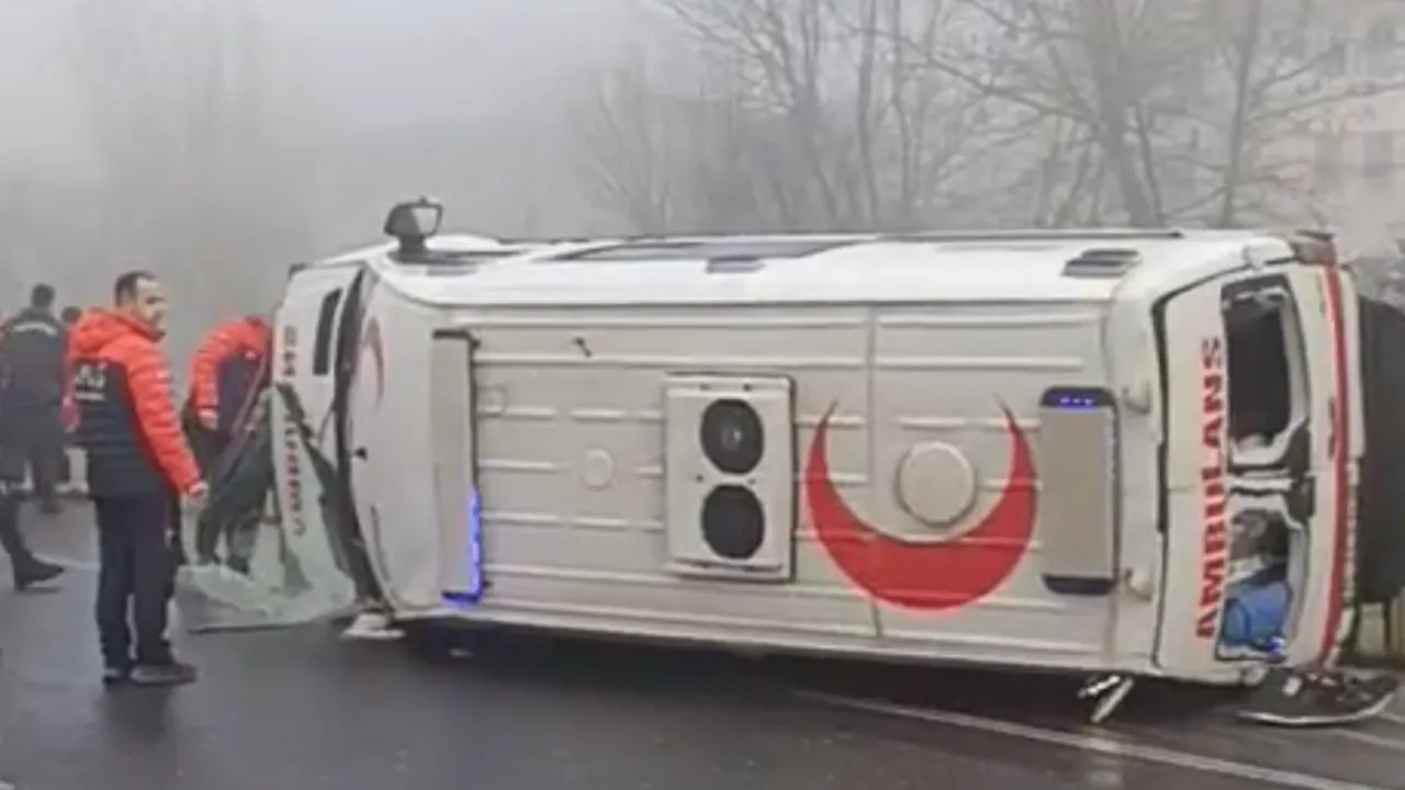 Düzce'de yoğun sis nedeniyle kontrolden çıkan ambulansın yan yatması sonucu 1 sağlık personeli yaralandı.