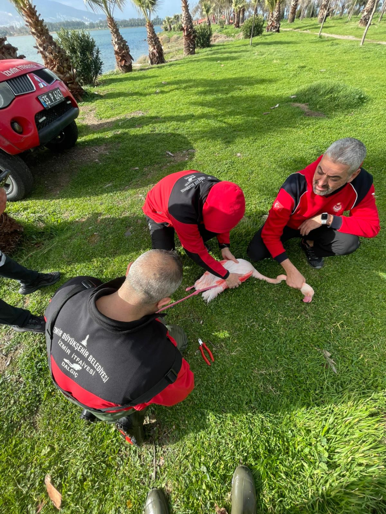 Denizde ve kıyı hattında yürütülen dikkatli ve kontrollü operasyon sonucunda flamingoya ulaşıldı. Ayağına dolanan misina nedeniyle hareket kabiliyeti kısıtlanan flamingo, bota alınarak güvenli şekilde karaya çıkarıldı. Ekipler, hayvana zarar vermeden misinayı çıkardı.