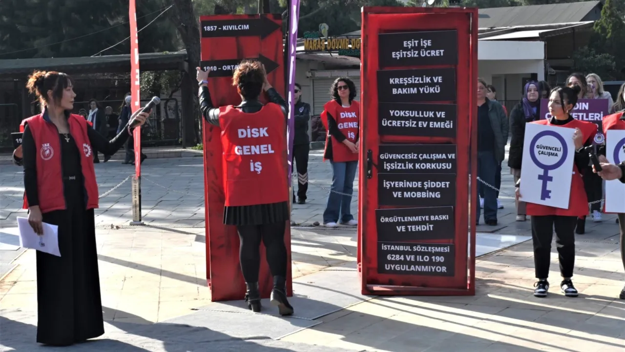 İZMİR (İGFA) - Kadınların yaşadığı sorunların sembolik olarak anlatıldığı etkinlikte, meydanda kurulan kırmızı kapı üzerindeki sorunlar; 'dayanışma, örgütlülük, adalet, yaşam hakkı, eşitlik, kamusal bakım, sosyal haklar ve güvenceli çalışma' yazılı anahtarlarla açılarak çözüm iradesi simgesel olarak ortaya kondu. Kadın ritim grubunun performansı alandaki coşkuyu yükseltirken, katılımcılar halaylar çekip horonlar tepti, sloganlarla kadın dayanışmasını büyüttü.
