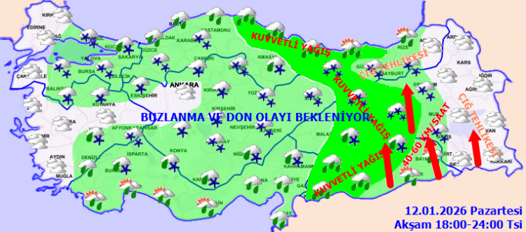 12 Ocak Pazartesi gününe ilişkin hava tahmin raporunu yayımlayan Meteoroloji Genel Müdürlüğü uyardı: Türkiye genelinde yağış, sert rüzgar ve sıcaklık düşüşü etkili olacak. Birçok bölgede kuvvetli yağış, fırtına, buzlanma ve çığ riski bulunuyor.