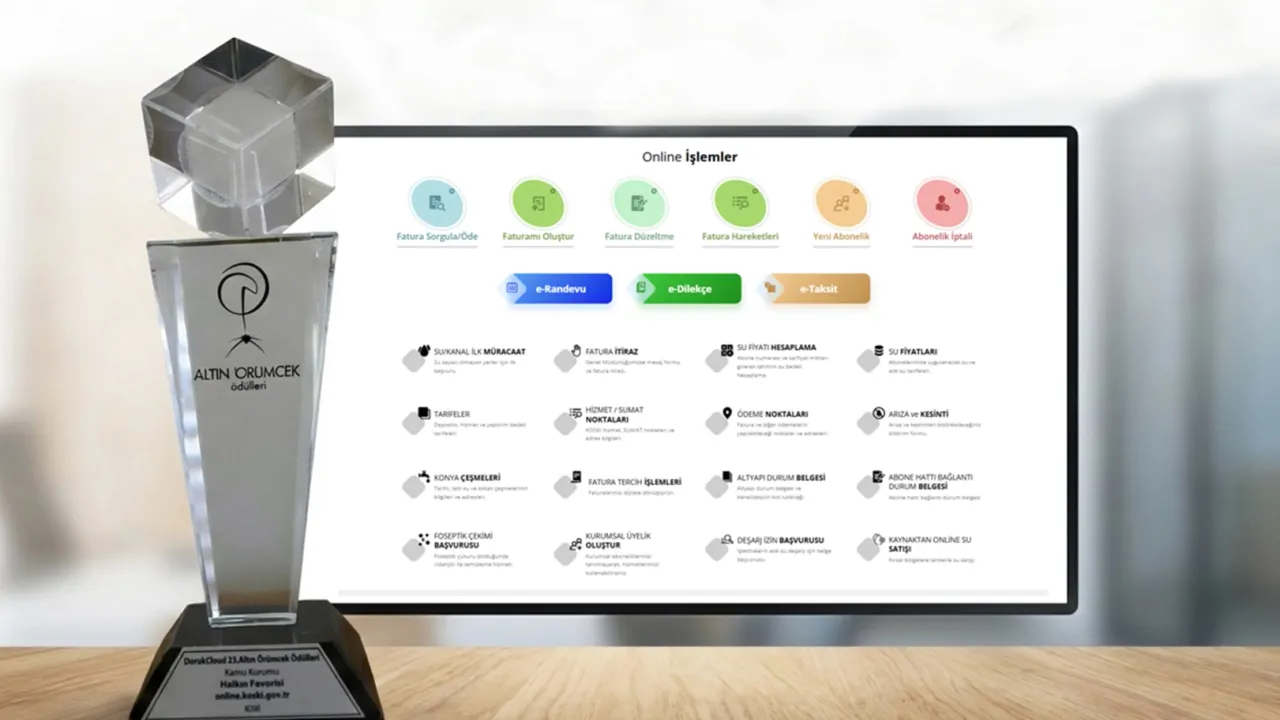 KONYA (İGFA) -Konya Büyükşehir Belediyesi KOSKİ Genel Müdürlüğü, dijital kanallar üzerinden sunduğu hizmetleri sürekli geliştirerek vatandaşların işlemlerini daha hızlı, kolay ve güvenli şekilde gerçekleştirebilmesi için çalışmalarını kararlılıkla sürdürüyor. Bu kapsamda KOSKİ Genel Müdürlüğü'nün dijital hizmet platformu Online KOSKİ, 23. Altın Örümcek Ödülleri 2025'te Kamu Kurumu Kategorisi 'Halkın Favorisi' seçilerek, vatandaş odaklı dijital hizmet anlayışını ödülle taçlandırdı.