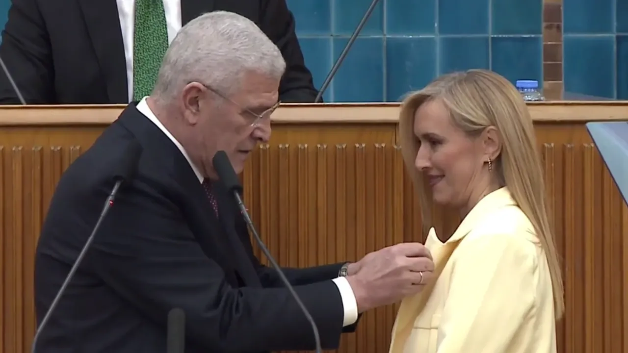 Rozet takma töreni, İYİ Parti grup toplantısında gerçekleştirildi ve Genel Başkan Müsavat Dervişoğlu tarafından Özkal Sayan'a takıldı.